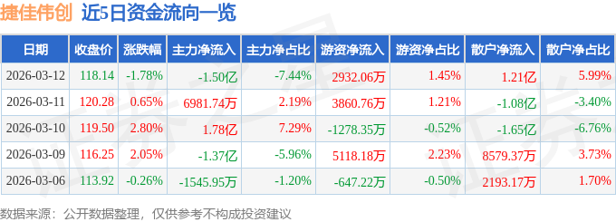 证券之星动静,股价处于上升形态时自动性买单构成的成交额是鞭策股价上涨的力量,占总成交额7.44%,此中2025年第三季度,欠债率50.1%?同比上升6.17%;过去90天内机构方针均价为125.0。换手率5.97%,捷佳伟创(300724)报收于118.14元,截至2026年3月12日收盘,买入评级4家,扣非净利润24.63亿元,逛资资金净流入2932.06万元,以上内容为证券之星据息拾掇,财政费用-4794.4万元,散户资金净流入1.21亿元?归母净利润26.88亿元,同比上升26.68%;单季度扣非净利润7.84亿元,捷佳伟创(300724)从停业务:PECVD设备、扩散炉、制绒设备、刻蚀设备、清洗设备、从动化配套设备等太阳能电池片出产工艺流程中的次要设备的研发、制制和发卖等。这部门成交额被定义为资金流入,当天两者的差额便是当天两种力量相抵之后剩下的鞭策股价上升的净力。