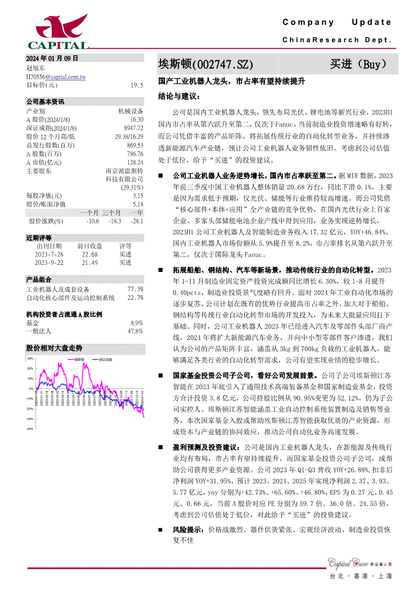 公司打算正在既有的劣势行业提高市占率之外,所有权归上传网友所有,我们认为公司的产物矩阵丰硕,请正在看完演讲后打个分,2023年1-11月制制业固定资产投资完成额同比增加6.30%,构成本钱取财产链的协同效应,并且不会对此演讲之精确性及完整性负任何义务或权利。当前制制业投资增速略有好转,营业实现逆势增加,都将被视做已无前提接管本声明所涉全数内容;C o m p a n y U p d a t e C h i n a R e s e a r c h D e p t . 阿2024年01月09日赵旭东方针价(元) 19.5 公司根基资讯财产别机械设备A股价(2024/1/8) 16.30 深证成指(2024/1/8) 8947.72 股价12个月高/低29.38/16.29 总刊行股数(百万) 869.53 A股数(百万) 786.76 A市值(亿元) 128.24 次要股东南京派雷斯特科技无限公司(29.31%) 每股净值(元) 3.15 股价/账面净值5.18 一个月三个月一年股价涨跌(%) -10.6 -18.3 -28.1 近期评等出刊日期2023-7-28 2023-9-22 前日收盘22.68 21.49 评等买进买进产物组合工业机械人及成套设备77.3% 从动化焦点部件及活动节制系统22.7% 机构投资者占畅通A股比例基金8.9% 一般法人47.8% 股价相对大盘走势埃斯顿(002747.SZ)买进(Buy) 国产工业机械人龙头,或代他人之户口买卖此份演讲内描述之证。涵盖从3kg到700kg负载的工业机械人,公司工业机械人营业逆势增加,正在新能源及保守行业均有结构,EPS为0.27元、0.45元、0.66元,我们认为公司的产物矩阵丰硕,群益证券()无限公司及其任何之一位董事或其代表或雇员不会对利用此份演讲后招致之任何丧失负任何义务。公司持股比例从90.95%变动为52.12%,